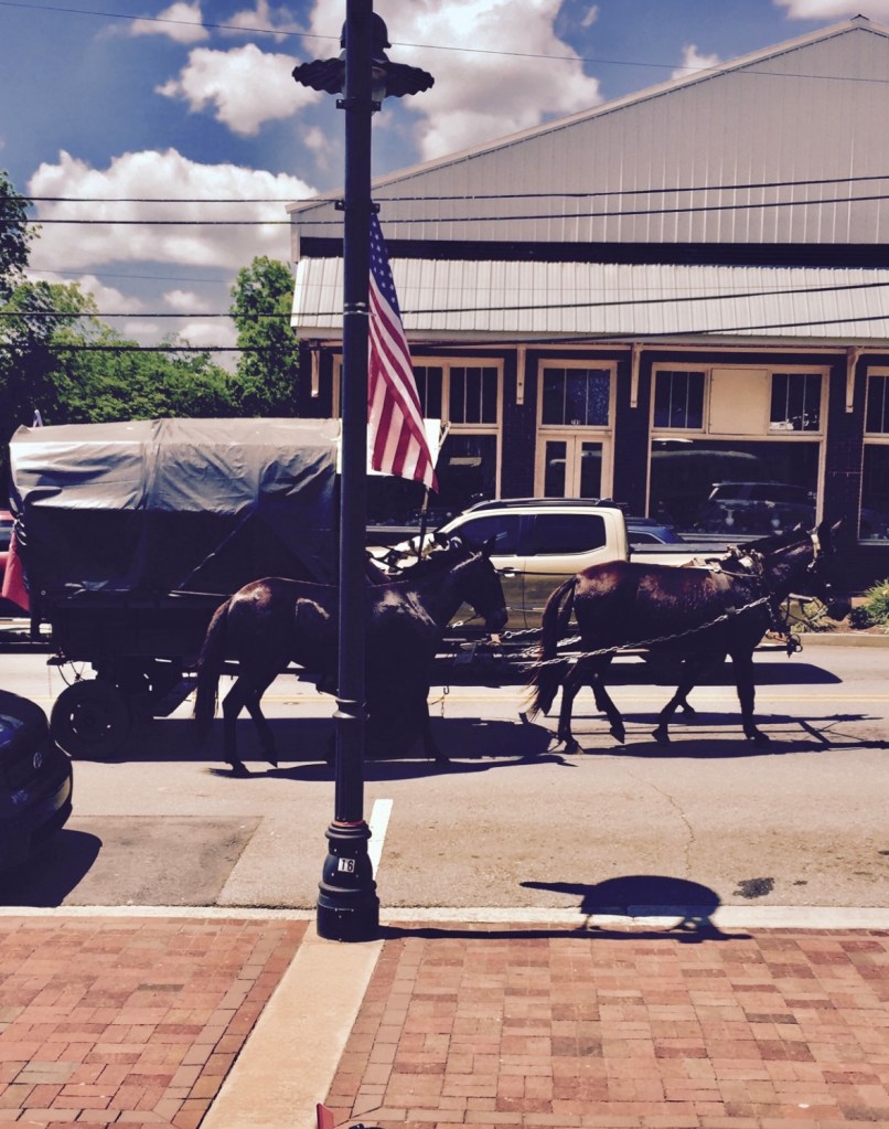 There are some sounds that are unforgettable, and sadly I haven’t seen since. I was on the sidewalk when I heard the clopping of hooves on the blacktop. What was the occasion? Was it a holiday that I had forgotten? No, it was just an ordinary Sunday afternoon when a gorgeous team of mules made its way down the main avenue of Ball Ground. What a sight to behold as everyone, and I mean EVERYONE stopped what they were doing and stood in awe of the team. They looked so proud and were completely at ease traveling in the traffic.